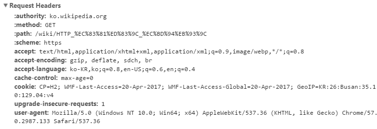 - 아래는 해당 페이지 HTTP Request의 header 부분의 이미지 : 응답 본문 아님