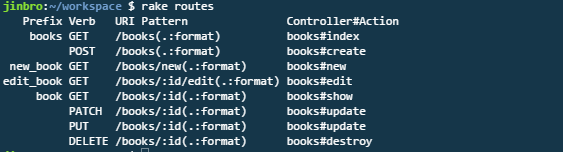 - 실제 주소는 http://도메인/books 혹은 뒤에 book 자원 중 하나에 대한 처리(:id), book 자원 새로 만들기 new 만 있음