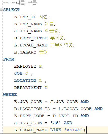 -- 직급이 대리이면서 아시아 지역에 근무하는 직원조회 EMPLOYEE JOB LOCATION + DEPARTMENT