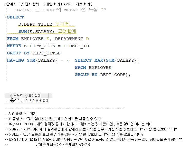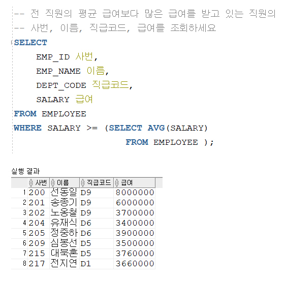 -- 서브쿼리는 SELECT, FROM, WHERE, HAVING, ORDER BY에도 사용 가능