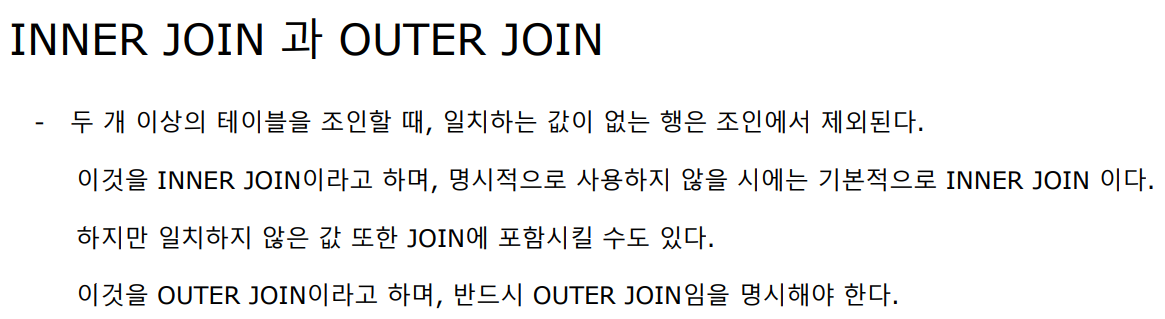 INNER JOIN 과 OUTER JOIN - 두 개 이상의 테이블을 조인할 때, 일치하는 값이 없는 행은 조인에서 제외된다. 이것을 INNER JOIN이라고 하며,