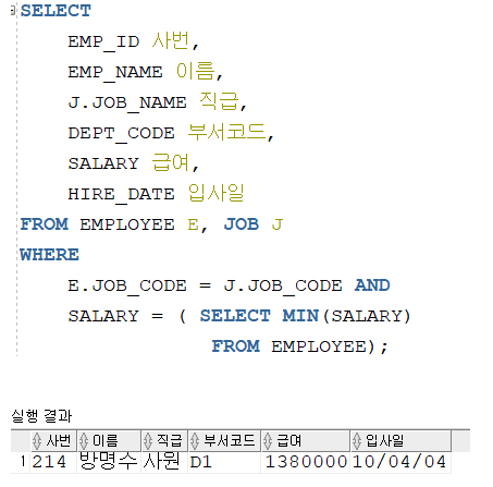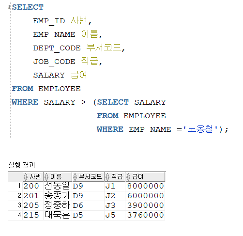 --단일행 서브쿼리 : 서브쿼리의 조회 결과값이 1개 행일때