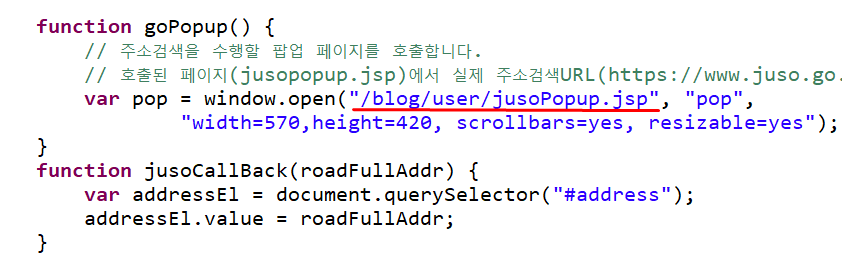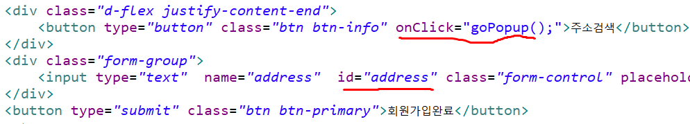 <button type="button" class="btn btn-info" onClick="goPopup();">주소검색</button>